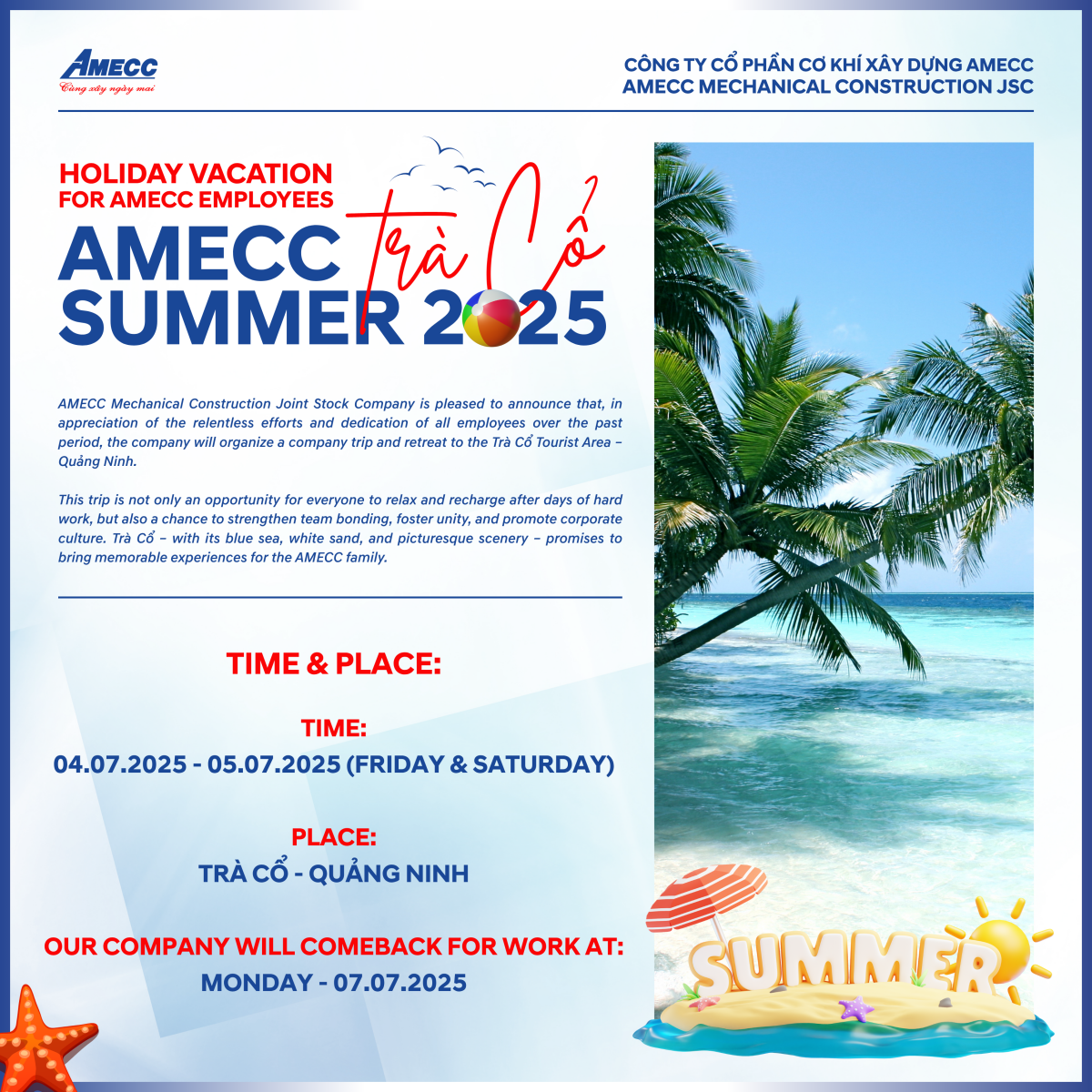This trip is not only an opportunity for everyone to relax and recharge after days of hard work, but also a chance to strengthen team bonding, foster unity, and promote corporate culture. Trà Cổ – with its blue sea, white sand, and picturesque scenery – promises to bring memorable experiences for the AMECC family.