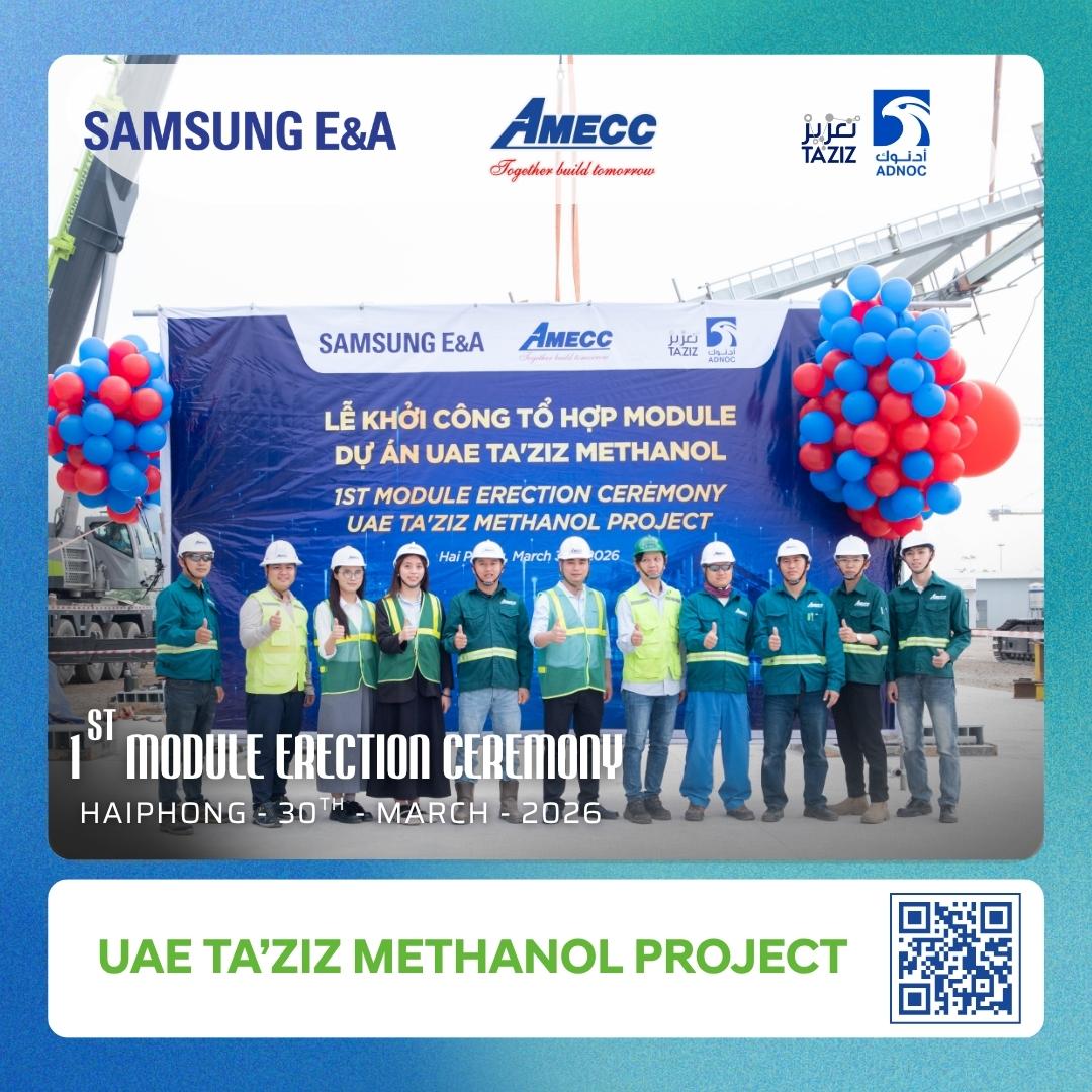 On March 30, 2026, the First Module Erection Ceremony of the UAE TA’ZIZ Methanol Project was held in Hai Phong in a formal and enthusiastic atmosphere. The ceremony was attended by representatives of key project partners including Samsung E&A, TA’ZIZ, ADNOC, along with AMECC’s engineers, specialists, and workforce.