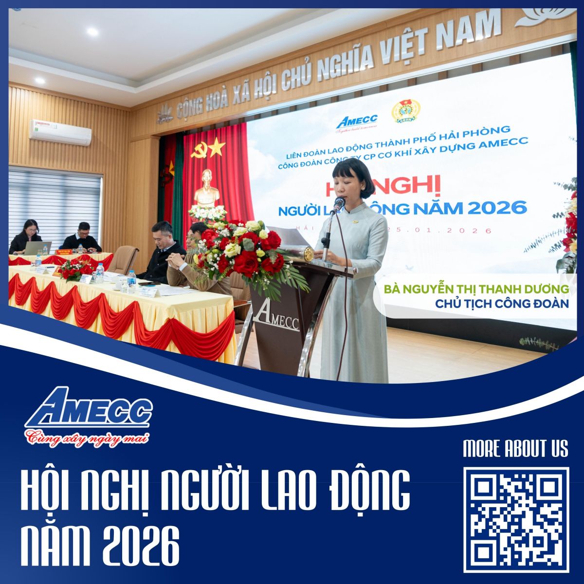 Hội nghị Người lao động năm 2026 của AMECC diễn ra lúc 09h00 ngày 25/01/2026 tại hội trường Công ty, với sự tham dự của Ban Lãnh đạo Công ty, Ban Chấp hành Công đoàn cùng đông đảo đại diện cán bộ, công nhân viên, người lao động trong toàn doanh nghiệp.